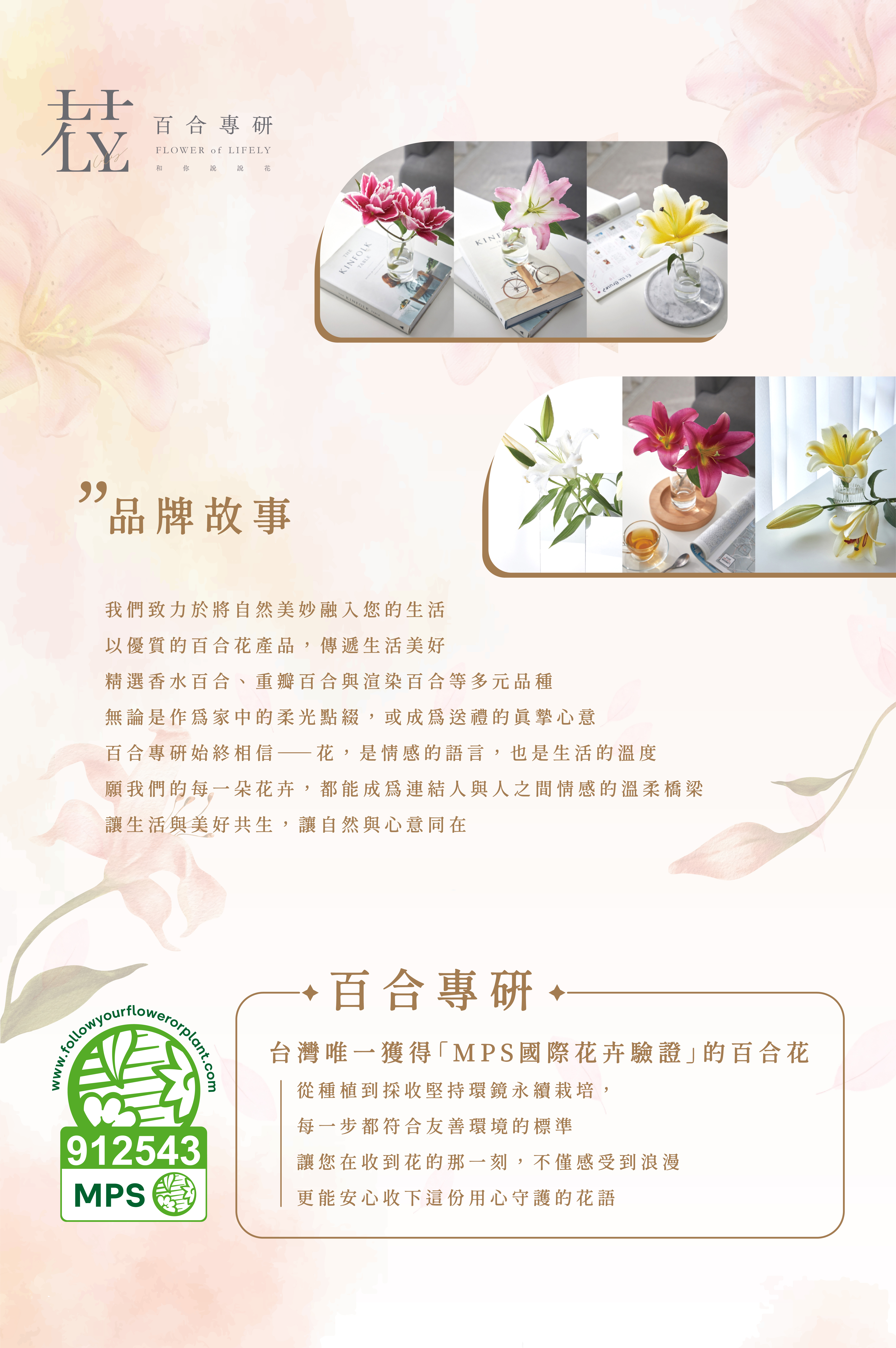 *台灣唯一榮獲荷蘭「MPS花卉永續驗證標章」的百合花品牌。