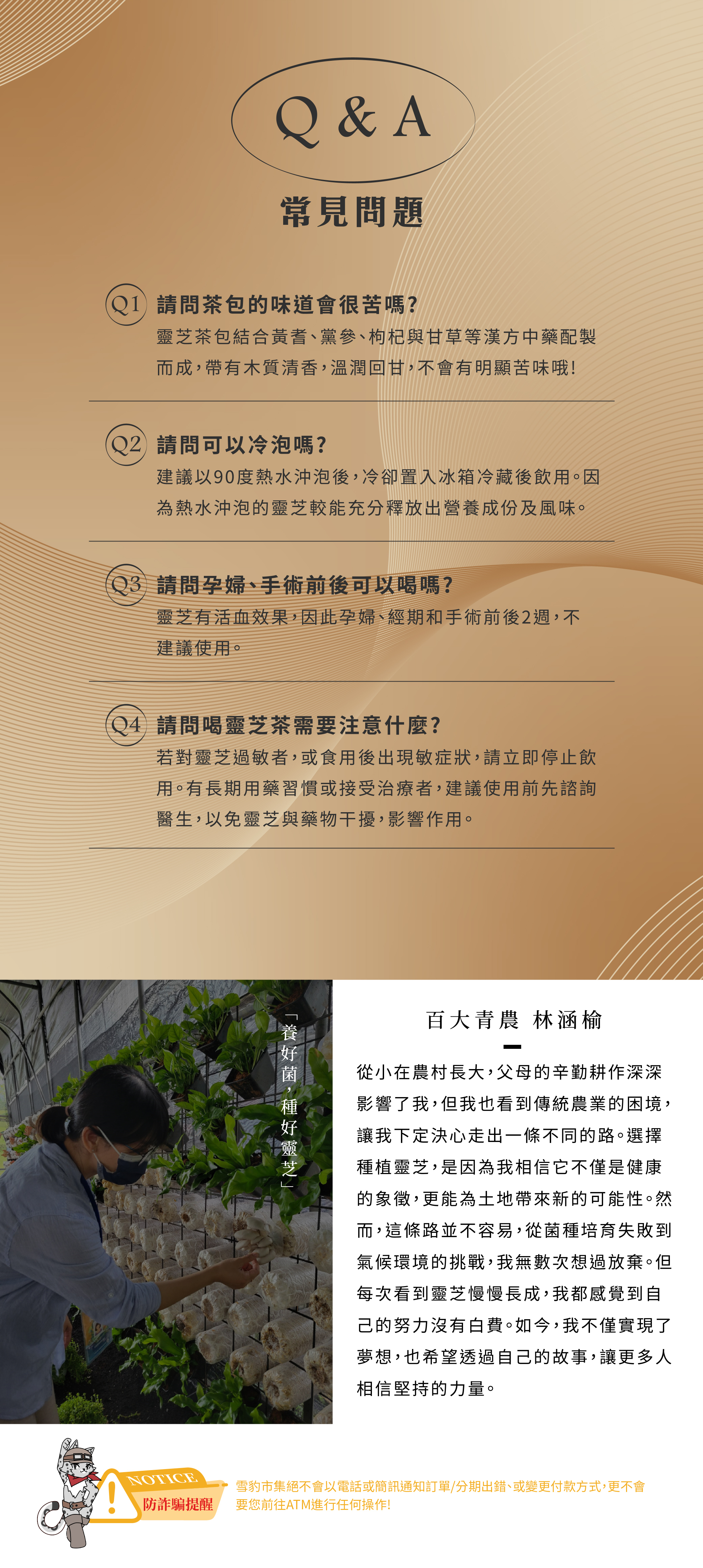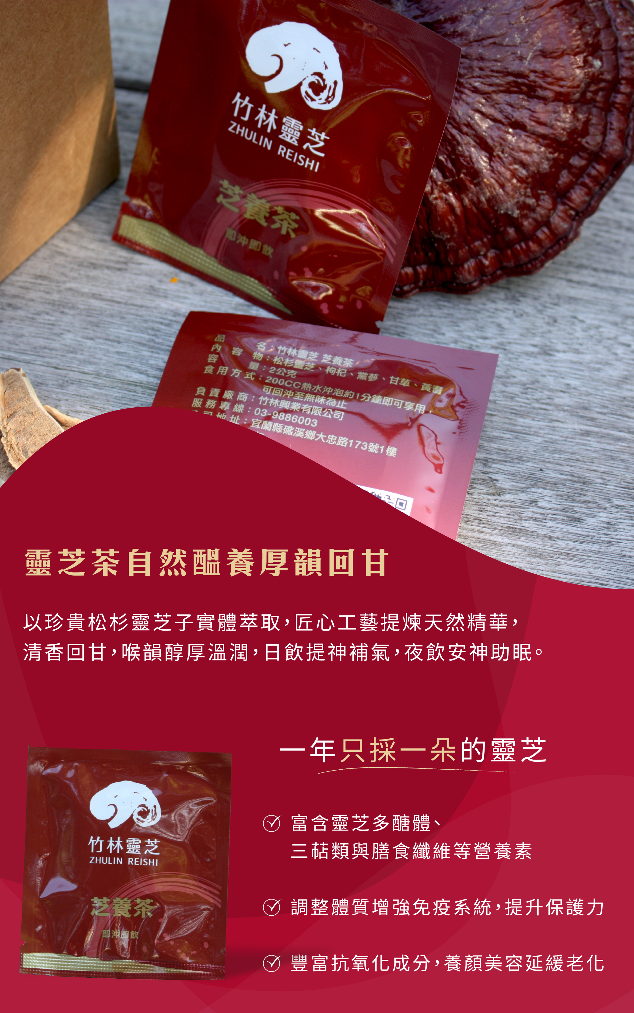 百大青農精心栽培,採用源自日本的松杉靈芝菌種,一年僅採一朵,以靈芝子實體匠心萃取,完整保留多醣體、三萜類等珍貴營養成分。